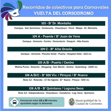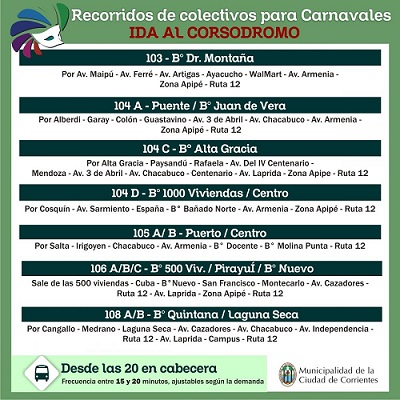 La Comuna capitalina dispuso que las diferentes líneas de colectivos trasladen vecinos y turistas de manera gratuita hasta el corsódromo. “Las unidades llegarán el ingreso al Perichón, donde darán un giro en “U” para dejar a los pasajeros en el ingreso al corsódromo.