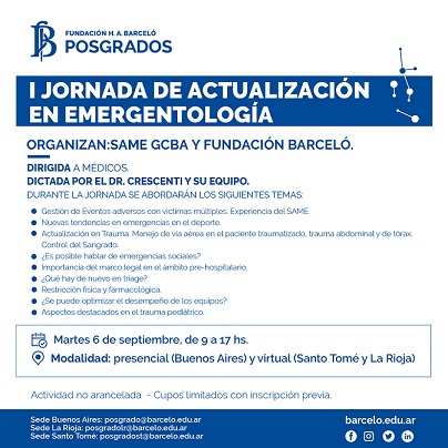 Dictada por el Director del Servicio de Atención Médica de Emergencias de la ciudad de Buenos Aires, Dr. Alberto Crescenti y su equipo, las jornadas permitirán a los profesionales asistentes, conocer las mejores prácticas vigentes en emergentología, además de abordar temas complementarios a la emergencia tales como marco legal en el ámbito pre hospitalario, optimización del desempeño de los equipos, entre otras.