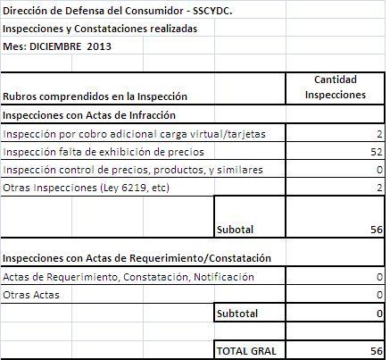 Política | La Dirección de Defensa del Consumidor dependiente del Ministerio de Industria, Trabajo y Comercio, informa que a través de su cuerpo de inspectores durante el pasado mes de diciembre de 2013, se han llevado a cabo controles e inspecciones a establecimientos comerciales, labrándose las correspondientes actas en los casos en los cuales se constatan presuntas infracciones a normas en vigencia.