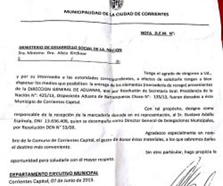 Política | Se conoció una nota del jefe comunal donde formaliza el pedido. Se trata de material que se encuentra depositado en la Aduana de Barranqueras, Chaco. Legisladores nacionales anticiparon que presentarán una solicitud de informe.