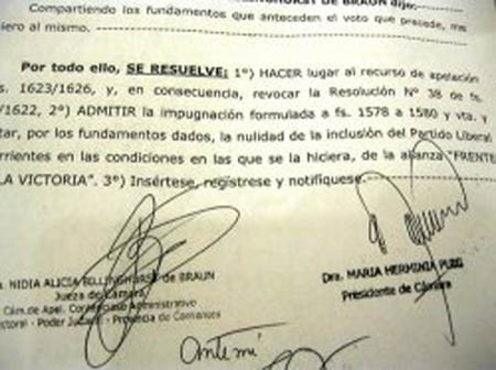 Política | La imposibilidad aliancista recae en el sector encabezado por Josefina Meabe de Mathó, con vistas a los comicios del 15 de septiembre. El fallo responde a un pedido de impugnación que habían efectuado desde la esfera de Pedro Cassani.
