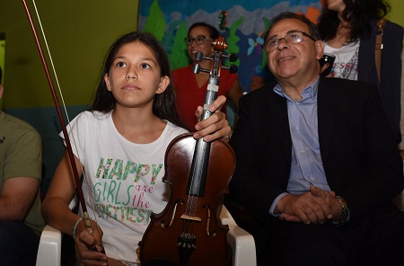 Información General | El intendente disfrutó este jueves de un ensayo de la orquesta infantil Gurisitos Cabezudos, cuyas actividades desarrollan en el Centro de Desarrollo Infantil Nº 9 del barrio San Benito. Está integrada por chicos de entre 7 a 14 años. Forma parte del programa nacional de orquestas sociales Andrés Chezarreta y permite que niños puedan acceder al aprendizaje del lenguaje musical de manera totalmente gratuita.